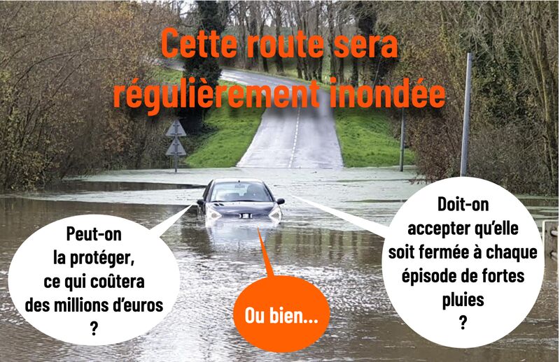 Dans le plan, on lit : « L’Etat doit montrer que s’adapter aujourd’hui va permettre aux Français de mieux vivre demain ». Cette phrase m’a fait tiquer. On va devoir faire des choix difficiles. Par exemple, comme le montre cette image de vulgarisation, on ne va pas pouvoir adapter toutes les routes de France :