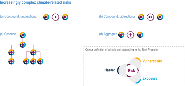 Les risques composés sont représentés avec la figure a (lorsqu’ils vont dans un seul sens) et la figure b (lorsqu’ils vont dans les deux sens). Il s’agit d’un phénomène de conjugaison de risques climatiques, résultant d’interactions entre différents aléas, et susceptibles d’engendrer des impacts plus importants que s’ils se produisaient isolément.
