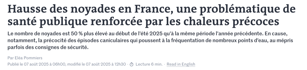 1/ Le sujet est loin de concerner seulement les plages : Le Monde indique que « 15 % des accidents de noyage ont lieu dans les plans d’eau comme les étangs ou les lacs, et près d’1/3 dans les cours d’eau. Ces lieux, qui attirent particulièrement les adolescents, nombreux à sauter dans des fleuves et rivières, sont à l’origine de plus de la moitié des morts par noyade chez des mineurs. Santé publique France alerte d’ailleurs sur la très forte hausse du nombre des accidents mortels de mineurs dans les cours d’eau : 15 sur la première moitié de l’été 2025, contre 4 en 2024. »