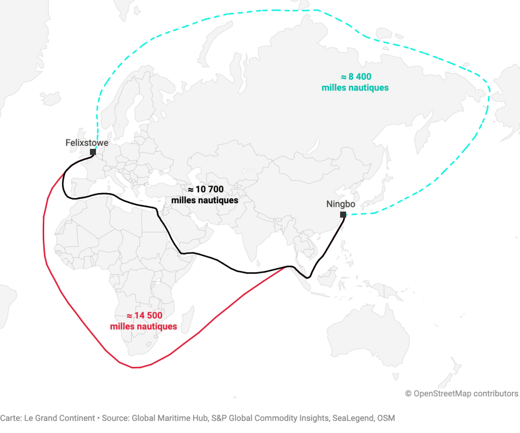 En milles nautiques, cela correspond à environ 8400 vs 10 700 et 14 500, d’après la carte ci-dessous (source : Le Grand Continent) :