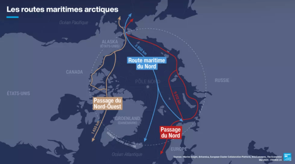 En parallèle, « deux autres routes pourraient par ailleurs se développer, par le passage du Nord-Ouest, par le Canada, et la route transpolaire qui passerait plus près du pôle », indique France24, qui l’illustre avec la carte suivante (réalisée par le studio graphique France Médias Monde) :
