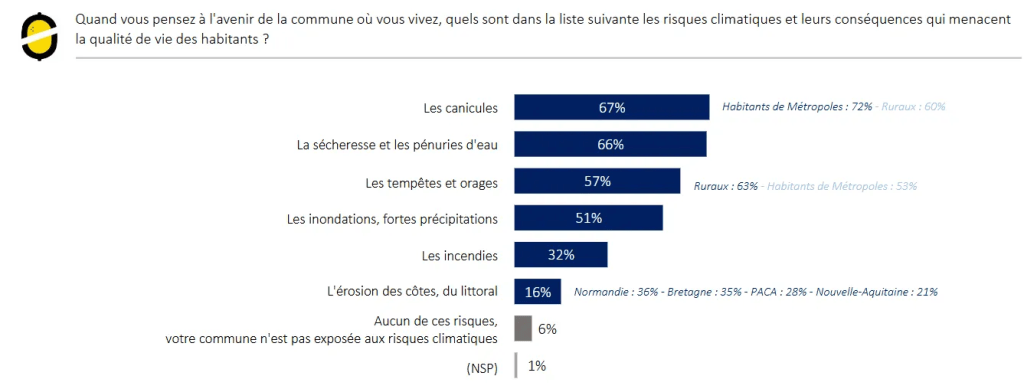 -Quels risques climatiques sont perçus comme les plus menaçants au niveau local par les sondés, pour leur qualité de vie ? Les canicules et “les sécheresses et pénuries d’eau” arrivent en tête, quasi ex-aequo. Puis, dix points en-dessous, les tempêtes et orages, et encore en-dessous les inondations. Il sera intéressant de voir l’évolution de ces réponses au cours des prochaines années.