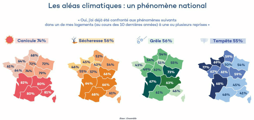 -Au cours des 10 dernières années, 86 % des Français ont été confrontés au moins une fois à un aléa climatique ayant touché leur domicile. Ils citent essentiellement : la canicule (74 %), la sécheresse ou la grêle (56 %), la tempête (55 %), la vague de froid (48 %) et l’inondation pluviale ou fluviale (33 %).